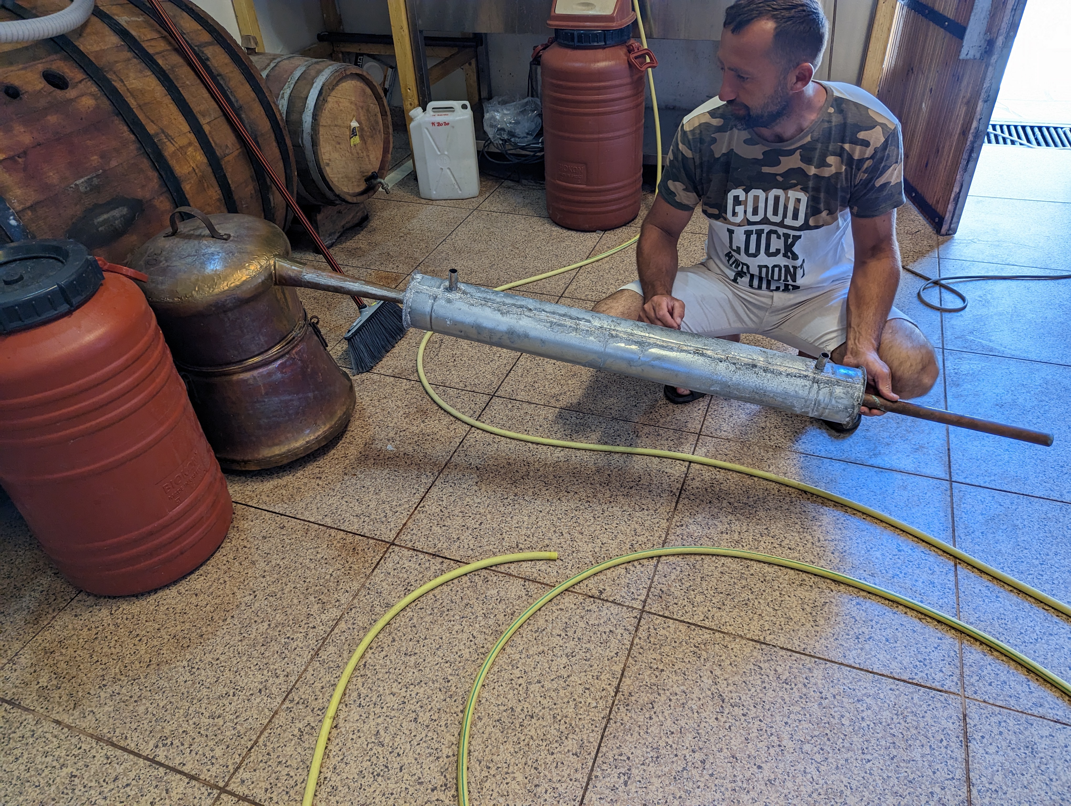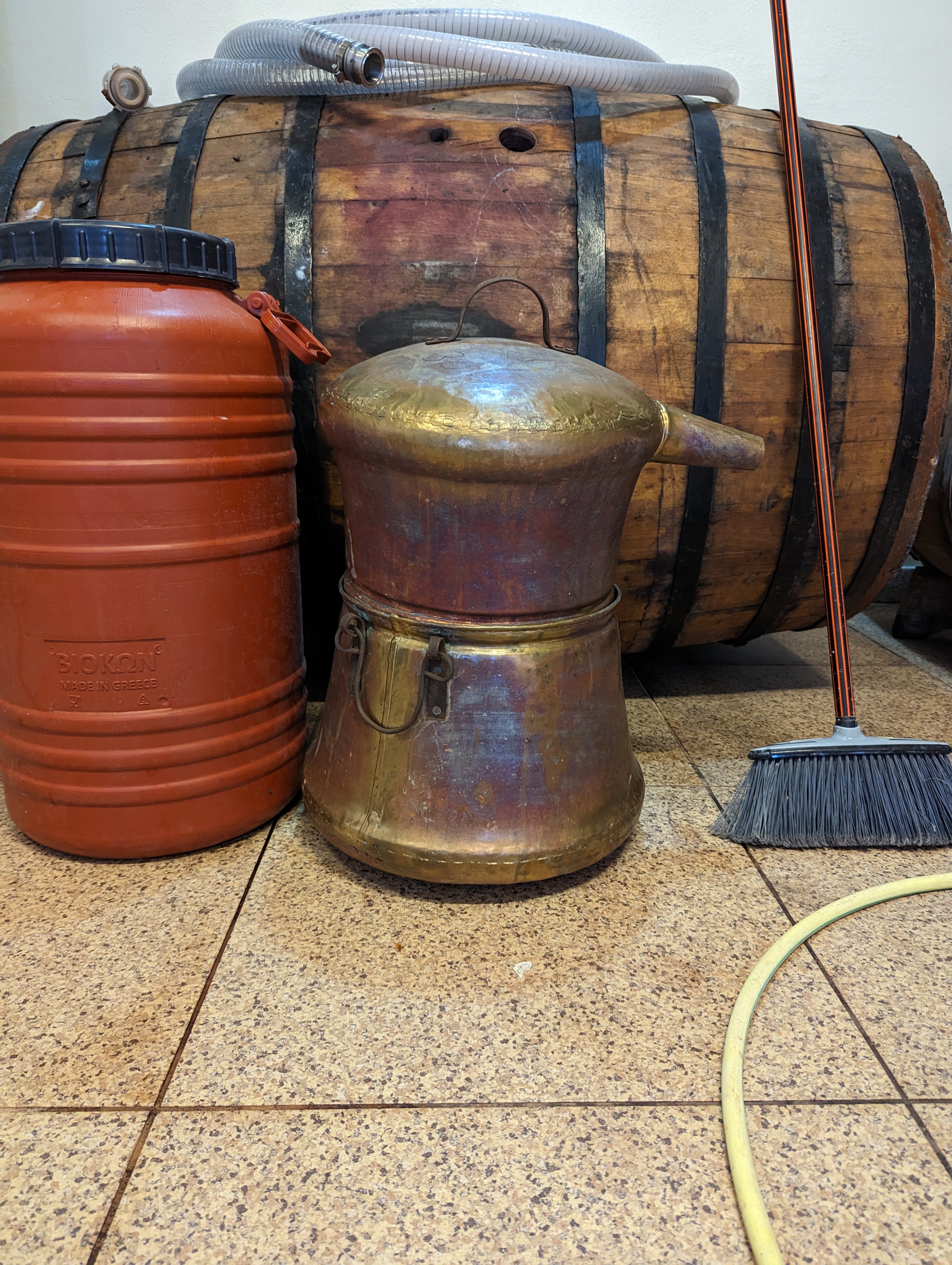 Fatjon showed me how the raki equipment worked. One can make raki from wine or from fermented fruit and the raki is the steam that liquifies after cooling from the heating process.