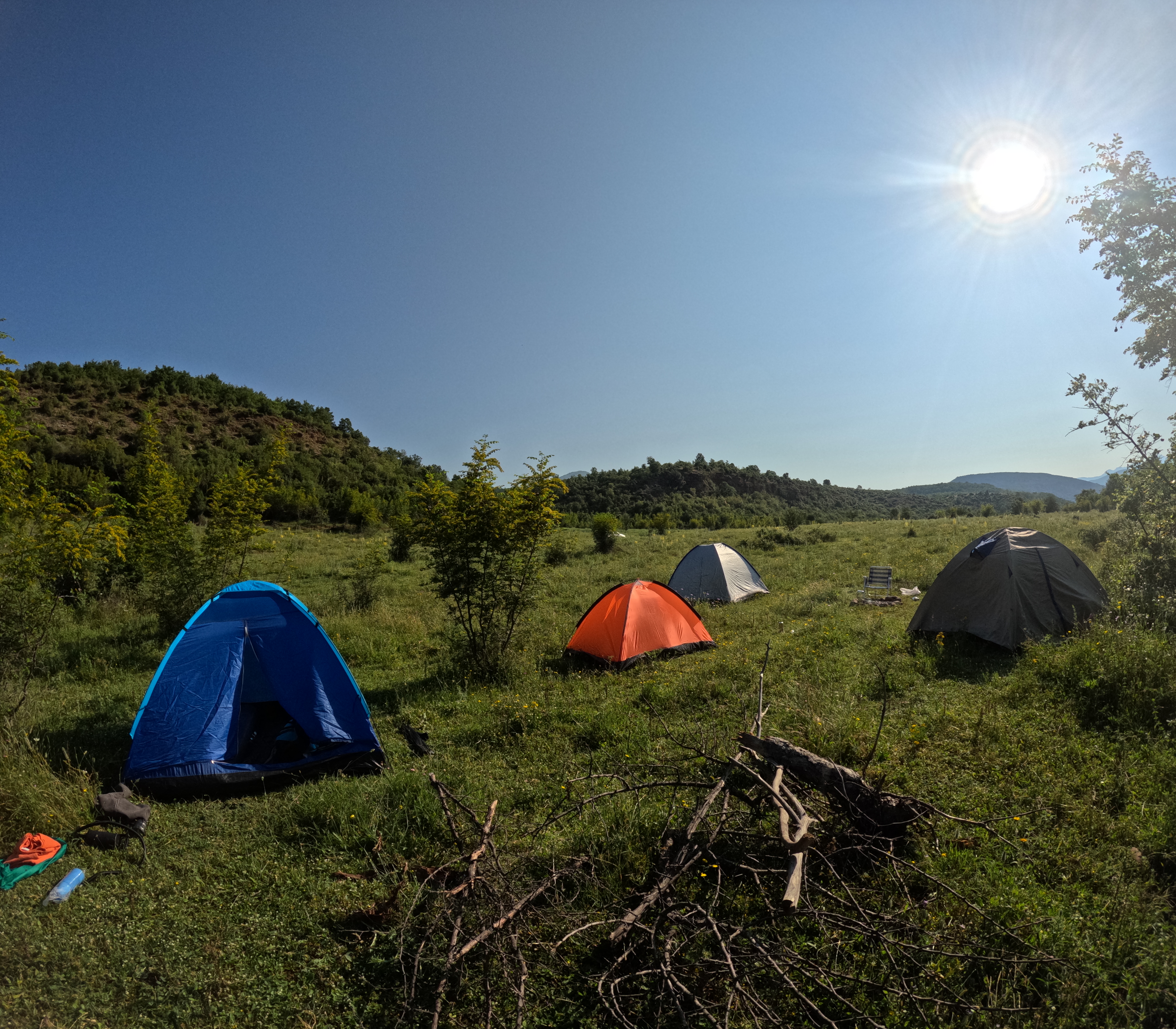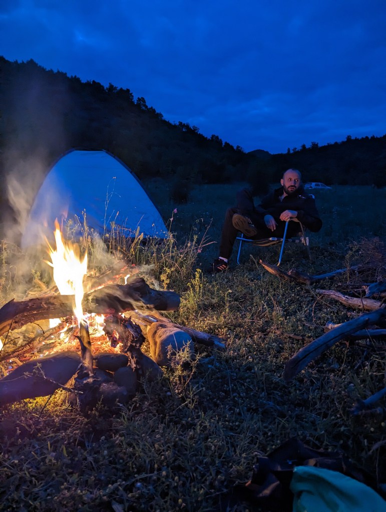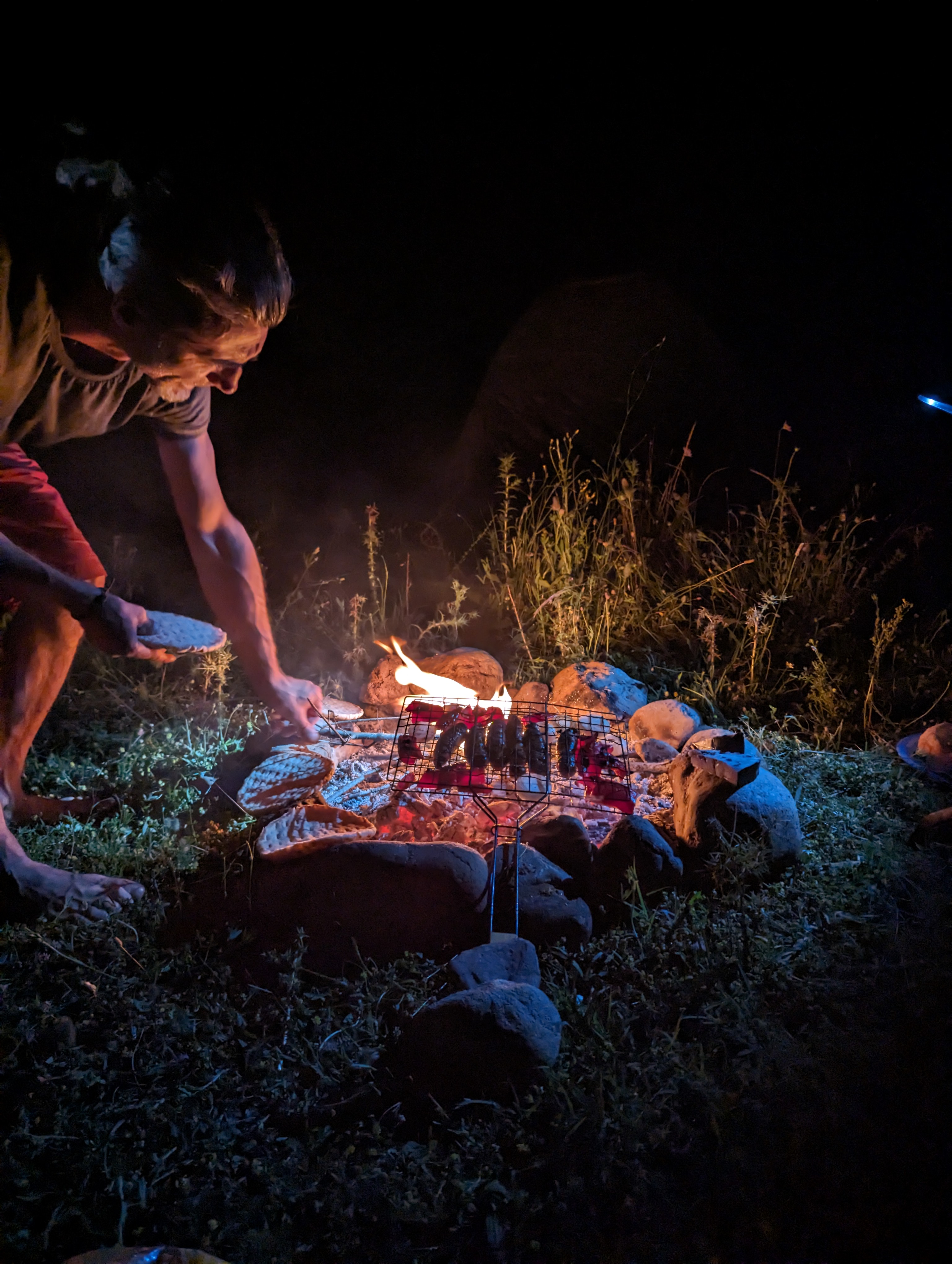 The guys had an ax and a few pocket knives to clear the prickly weeds. We gathered branches for fire from the dry riverbeds, and we grilled sausages and peppers and onions to have with pita and cheese. I helped with the fire. I felt one with nature, and I was very happy for the camping experience with my new friends.