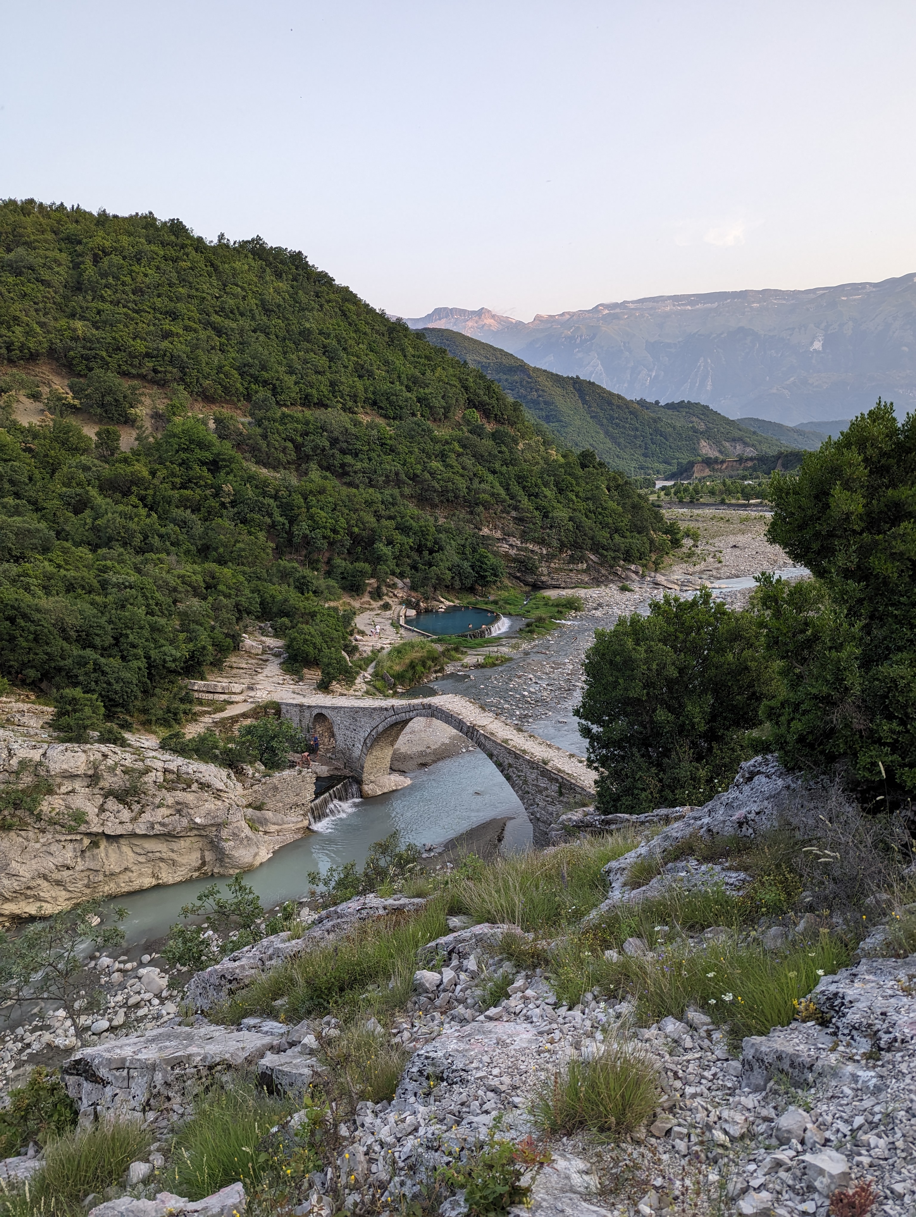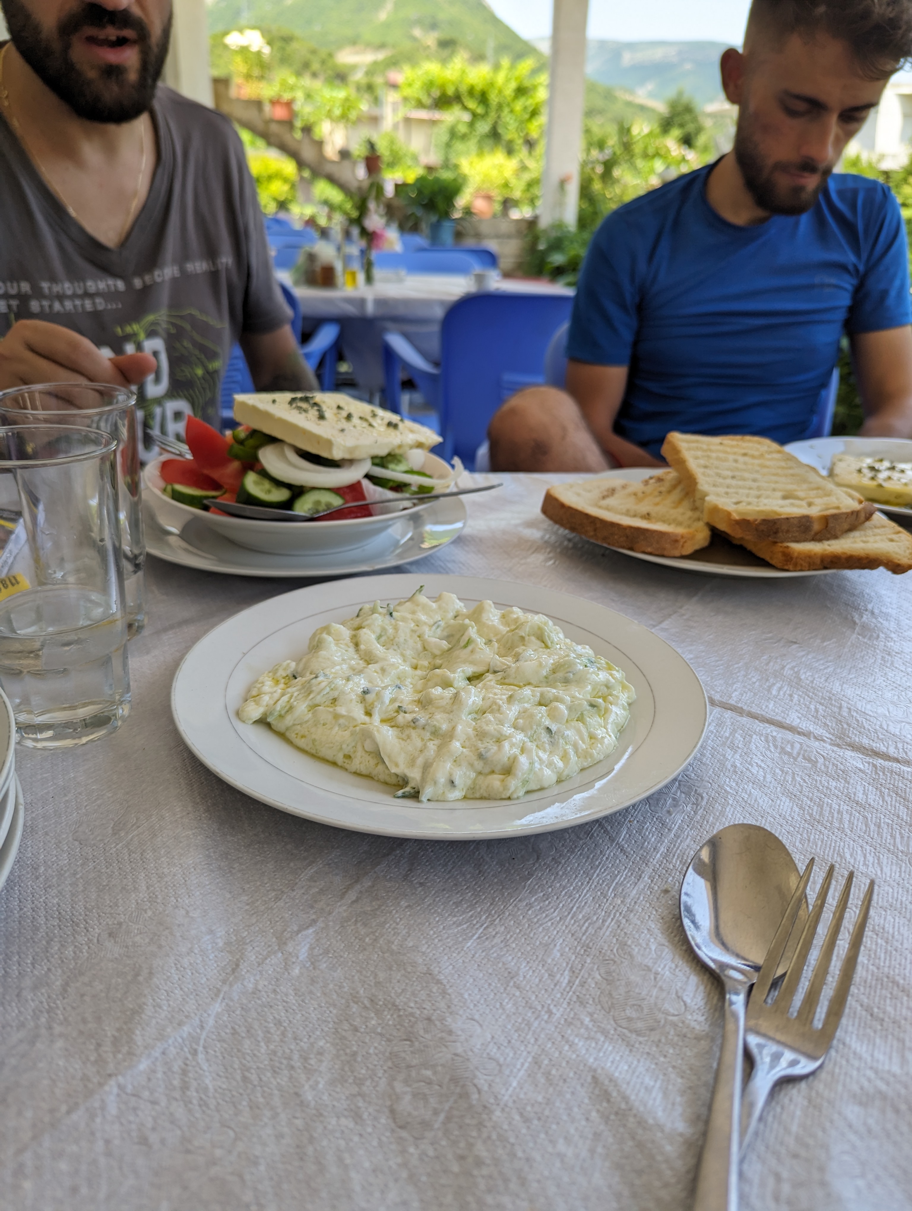 Përmet is known for the hot springs, but also for the food. It is so fresh and delicious. We stopped at a nearby village and had a nice meal of burek, sheep milk yogurt, greek salad, cooked goat, bread, and tzatziki!