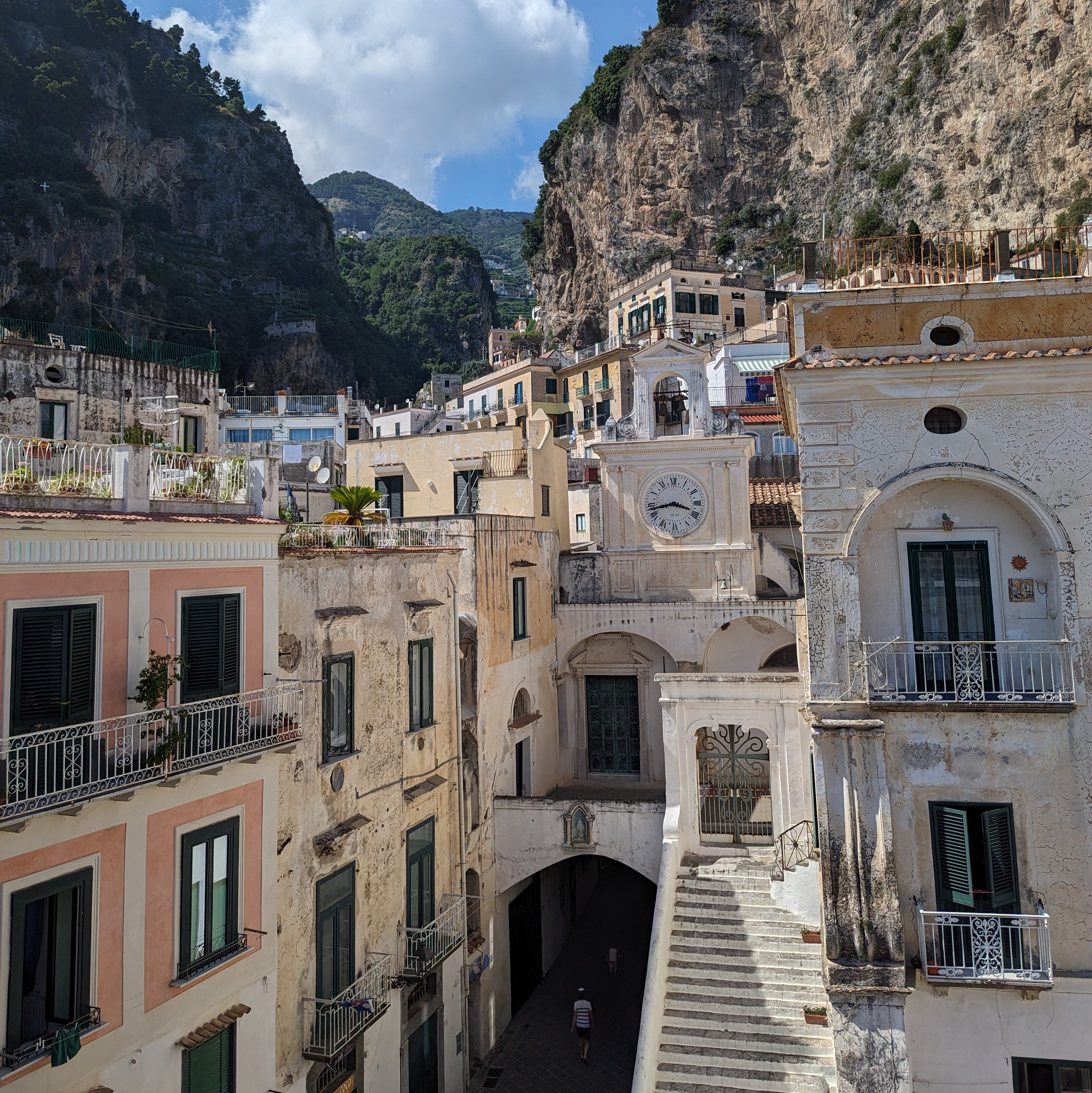 A cute town with a lot of stone buildings close together. Just south of Almafi. I was not able to enjoy much time here because I was eager to find an internet signal for an important meeting with my boss. The stone buildings and tall cliffs did not help with my pursuit for a signal, and it was during the heat of the afternoon when all the restaurants were closed. I quickly walked from Atrani to Almafi until I found a signal.