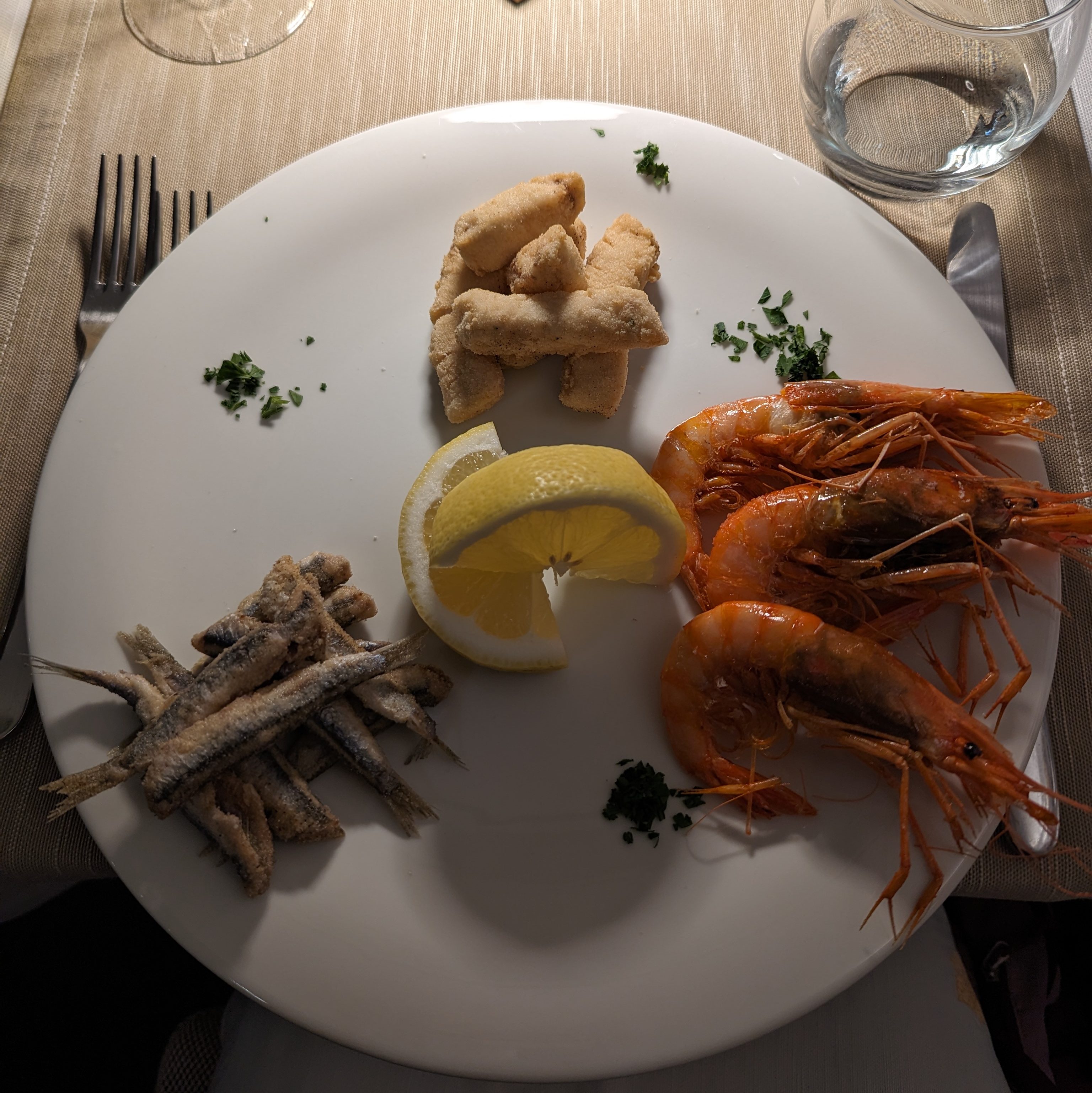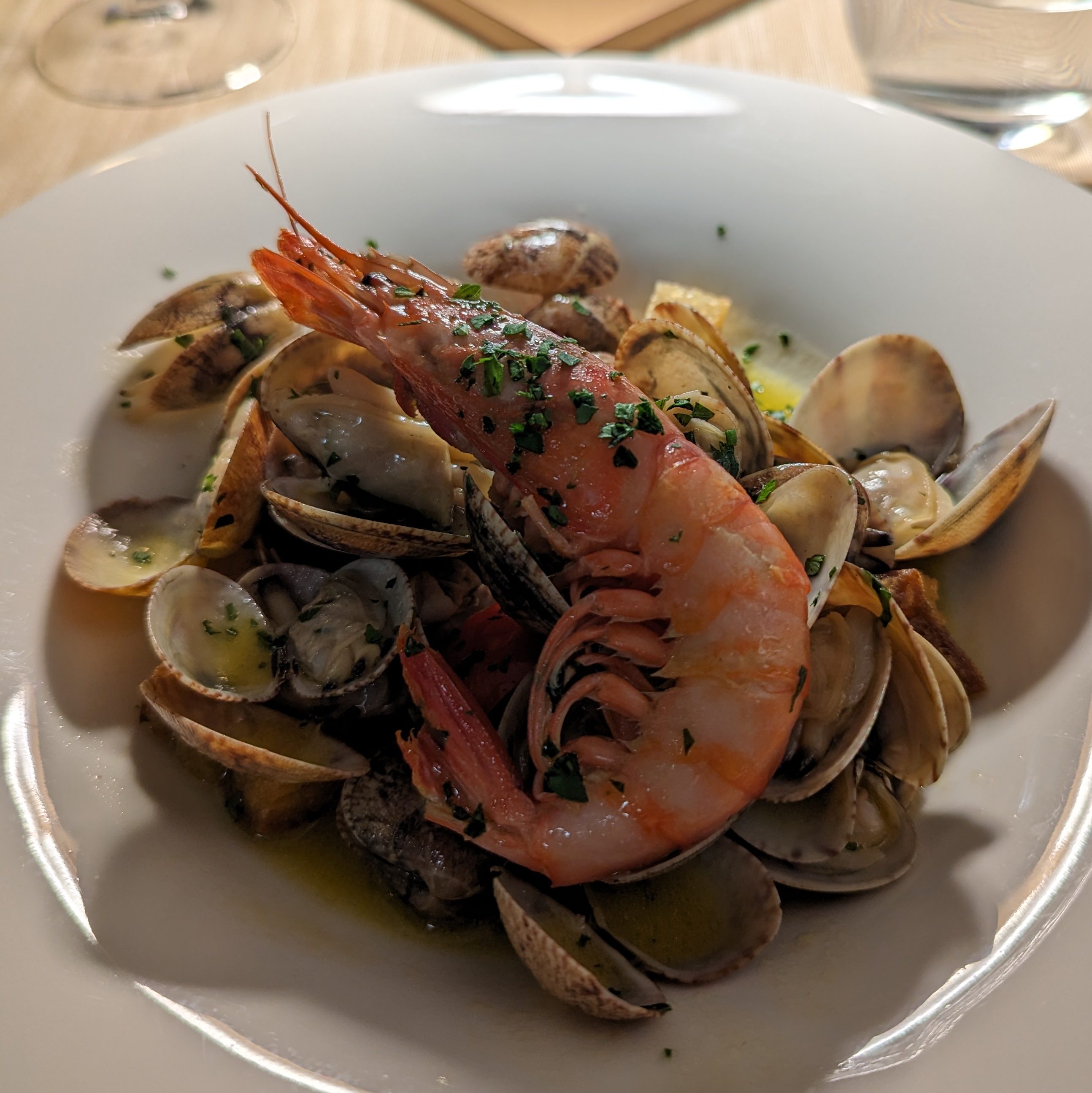 Phew!!! I thought I had lost count when a fifth dish appeared. Five seafood plates, a sorbet palette cleanser, a sorbet dessert, and 3 glasses of wine later, and it only cost 66€! Not bad at all for the Almafi coast!!! I think the price was that good because the location was away from the crowds.