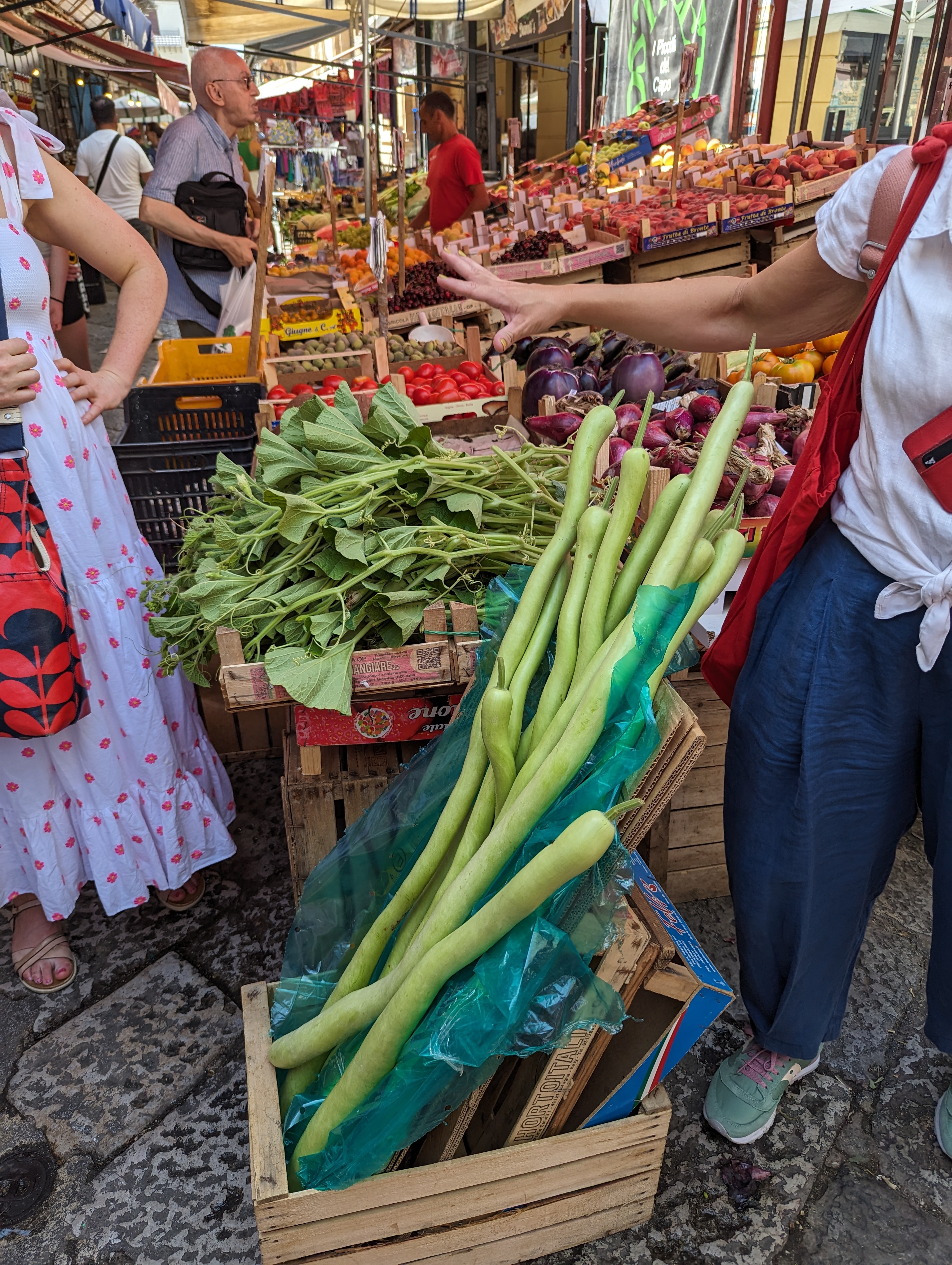These long squash plants are like zucchini. They would sell the zucchini and cook the leaves. The leaves used to be a Palermo “struggle food” for the poor to eat for survival. Now, pasta with zucchini leaves and mussels is a gourmet dish.