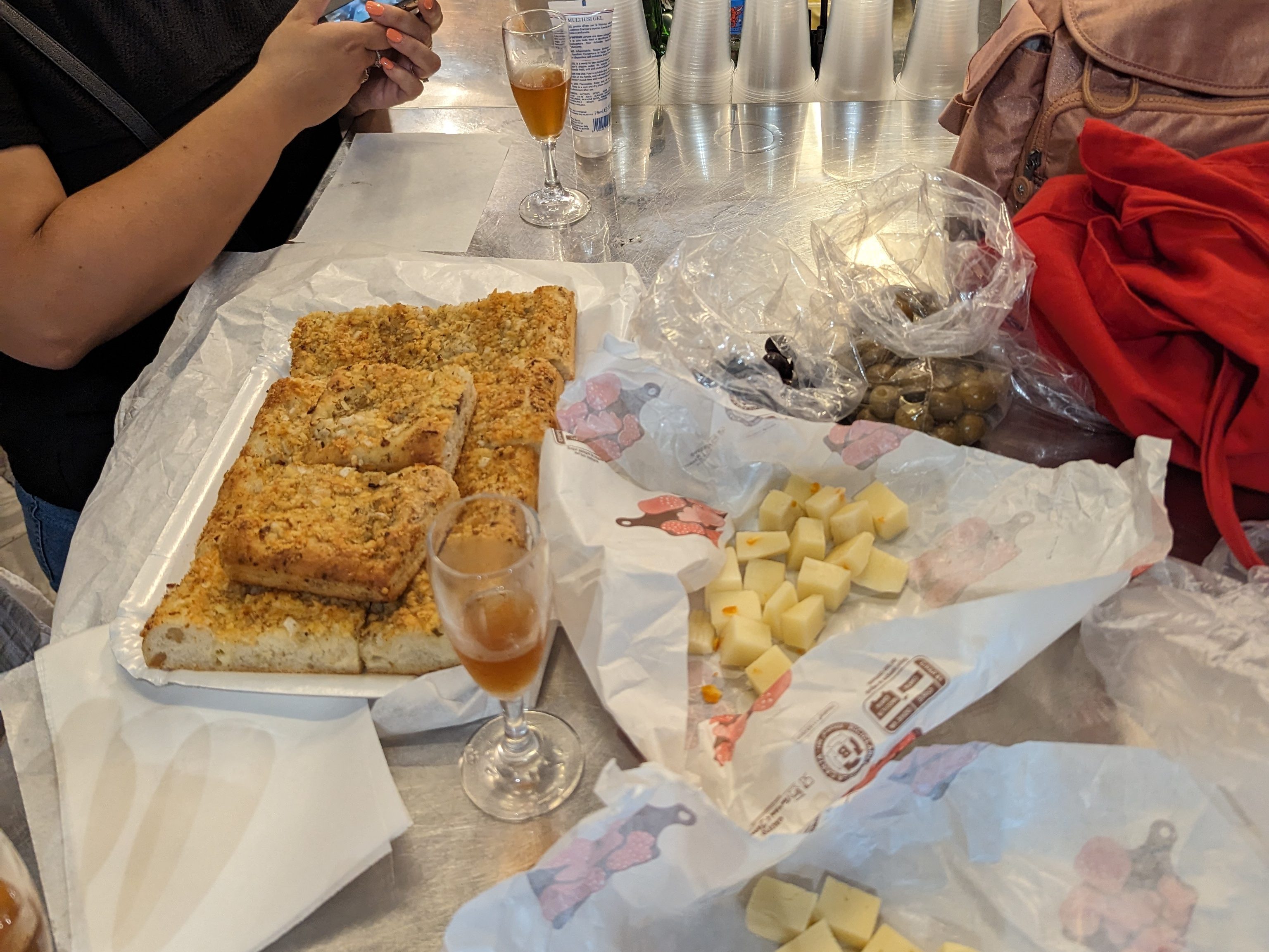 The flat piece of food is made of chickpea flour. Our guide said that sometimes families would make it in the shape of a fish to pretend it was fried fish when they couldn’t afford it. The filled, fried rice ball was delicious. It’s called “arancina” in Palermo (the west) and “arancino” in Catania (the east). There is also a croquet and German beer. The people of Palermo would rather drink German beer than beer made in Catania. Quite the rivalry!