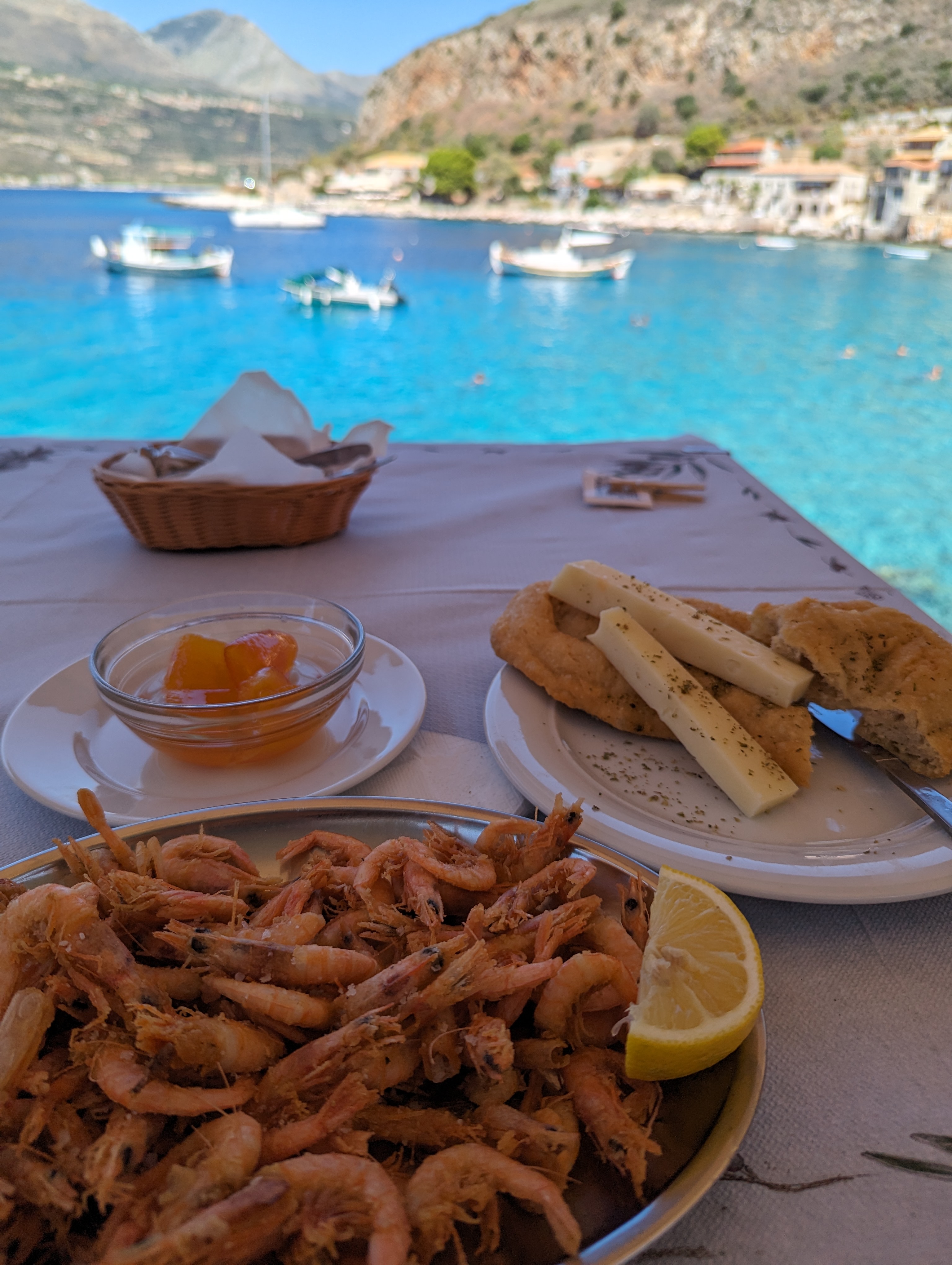 For lunch, I ordered a Mani style pita, and it was delicious. It had a somewhat focaccia texture to it and was lightly fried kind. I think pita is delicious, but Mani style pita is even more delicious. It was suggested to be served with Graviera cheese or honey. I opted for the cheese, but I know the honey would have been so good as well. I also ordered a spoon sweet and fried tiny shrimps.