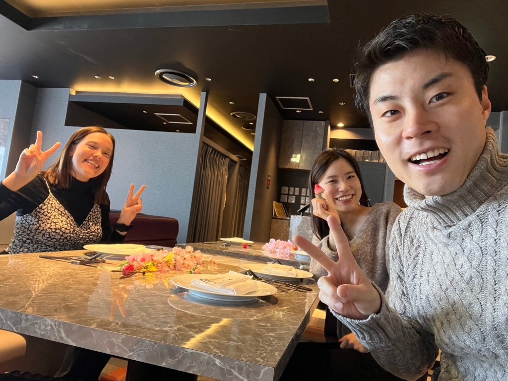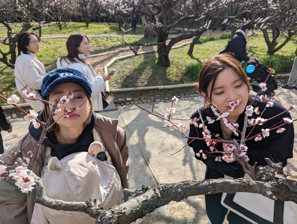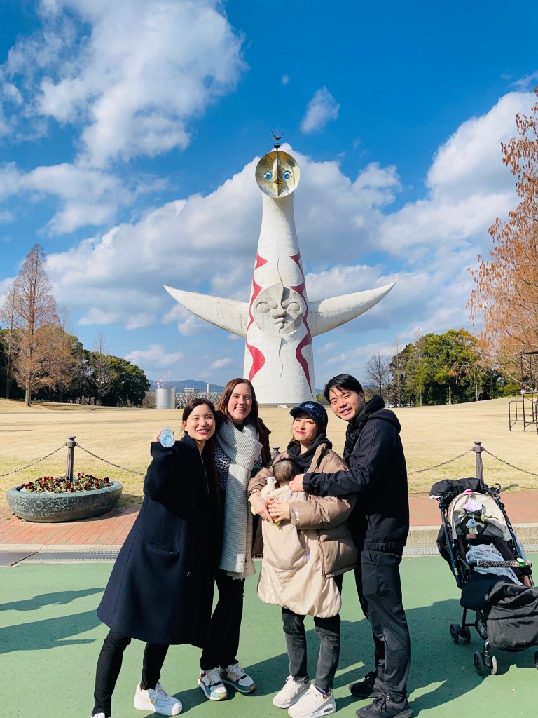 Ume means plum in Japanese. Right before the cherry blossoms bloom, the plum blossoms bloom. I am here during plum blossom season, and I was eager to experience that. In Osaka, an annual plum blossom festival is hosted at Expo 70 Commemorative Park. Seika and her brothers family brought me to the festival. We posed in front of the famous Tower of the Sun sculpture.