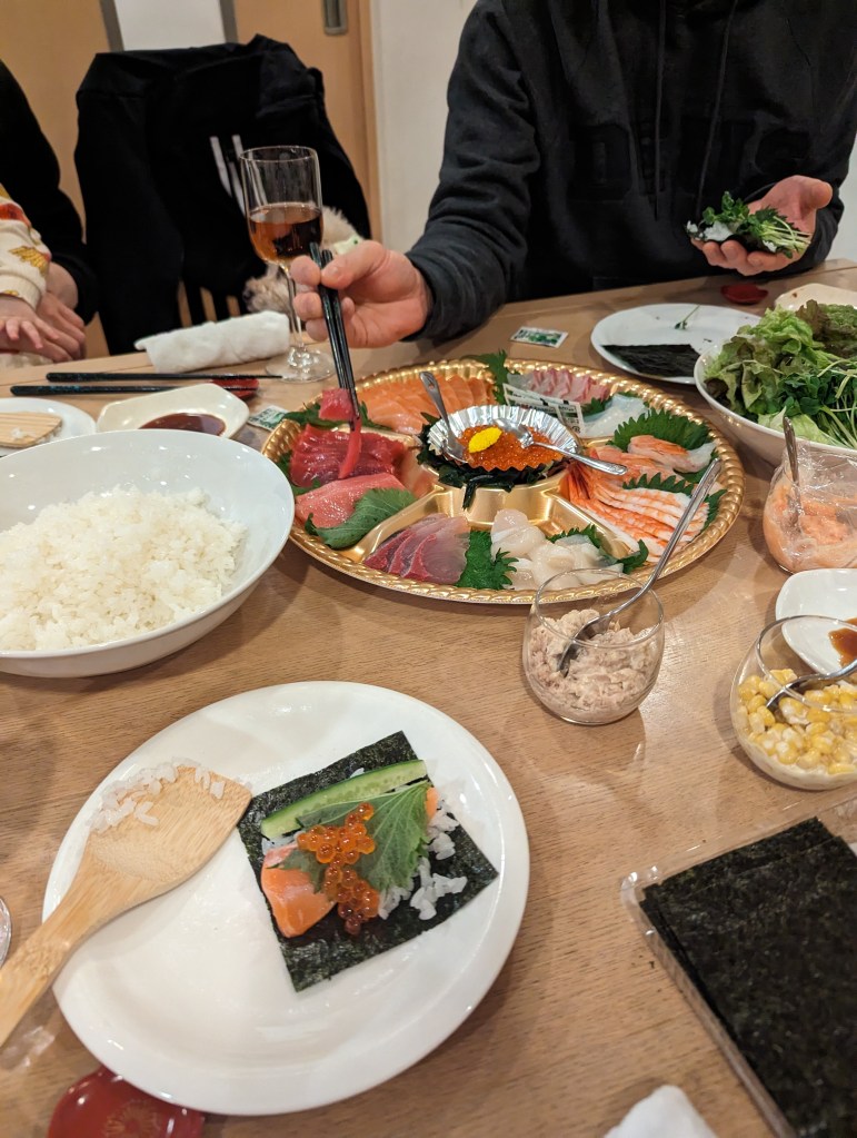 Seika’s Mom prepared a delicious spread of various seafoods and vegetables. I tried EVERYTHING, including things like raw squid, cod eggs, raw shrimp, raw scallops, fatty tuna, perilla leaves, Japanese mayonnaise, and even imitation crab that actually tastes like crab!