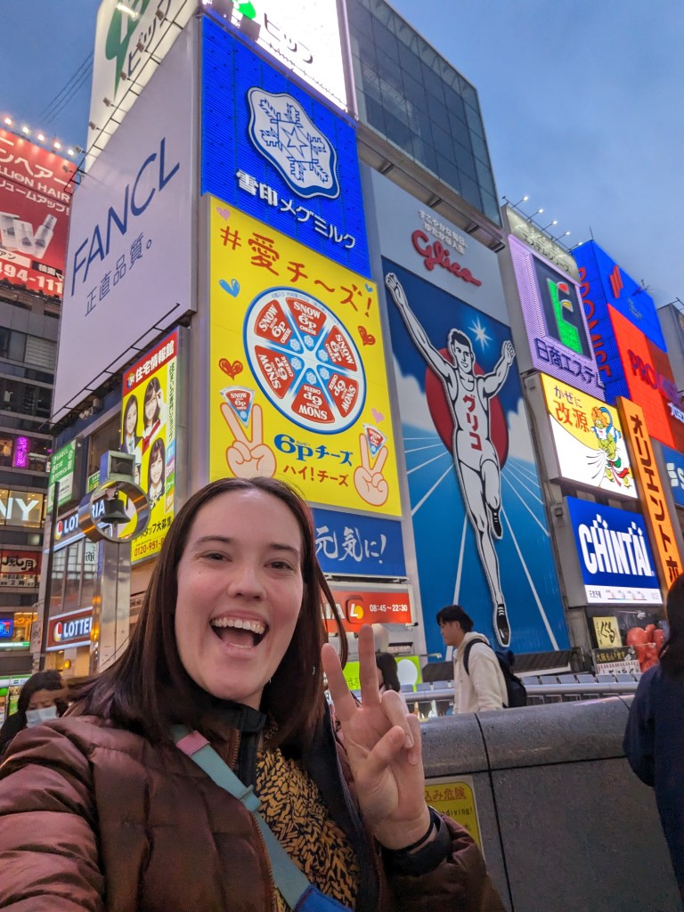 I ran into the Gilco Running Man sign. This sign is one of the most notable landmarks of Osaka. Gilco is a Japanese confectionery company that sells Pocky among other treats.