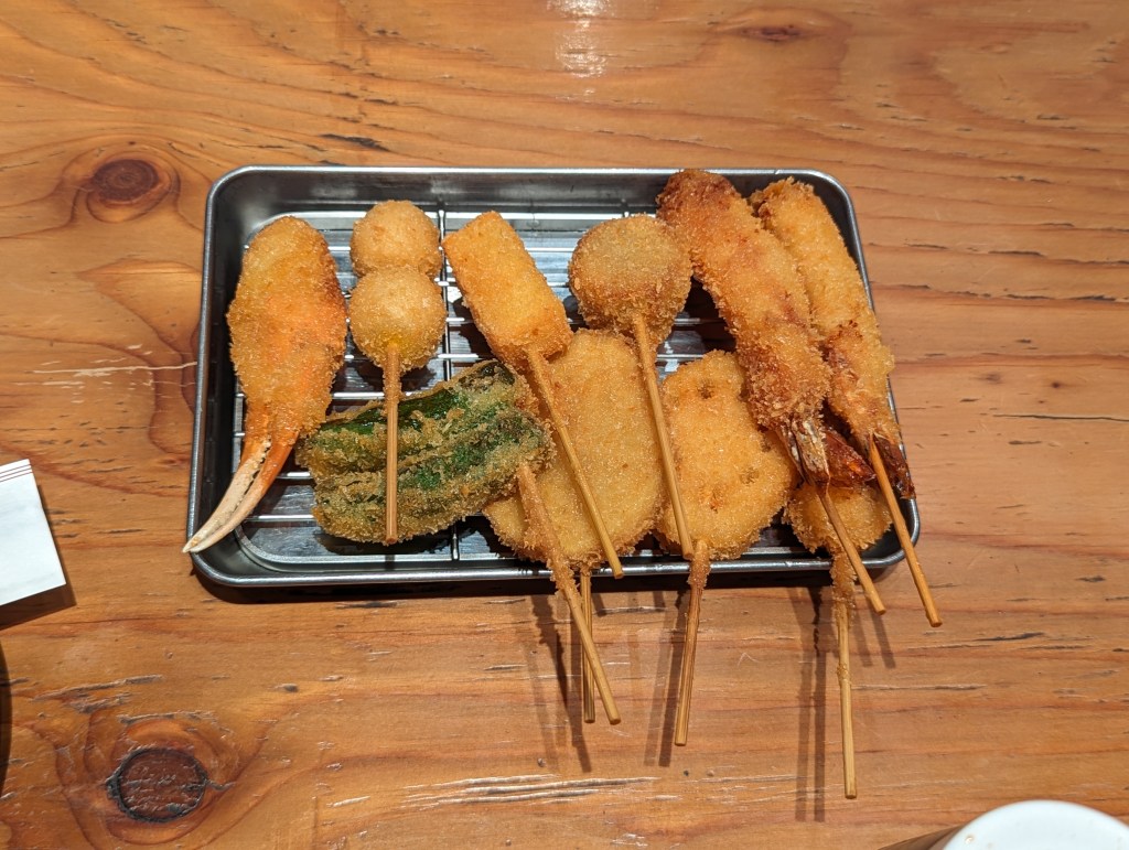 Osaka is known for a lot of very delicious foods, that includes okonomiyaki, takoyaki, and kushikatsu! Kushikatsu is a skewered item that is lightly breaded with flour and panko and deep fried. It is one of the favorite foods of Seika’s dad, so I wanted to make sure I tried it. I went to a place at Dotonburi to eat kushikatsu.