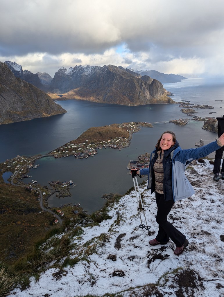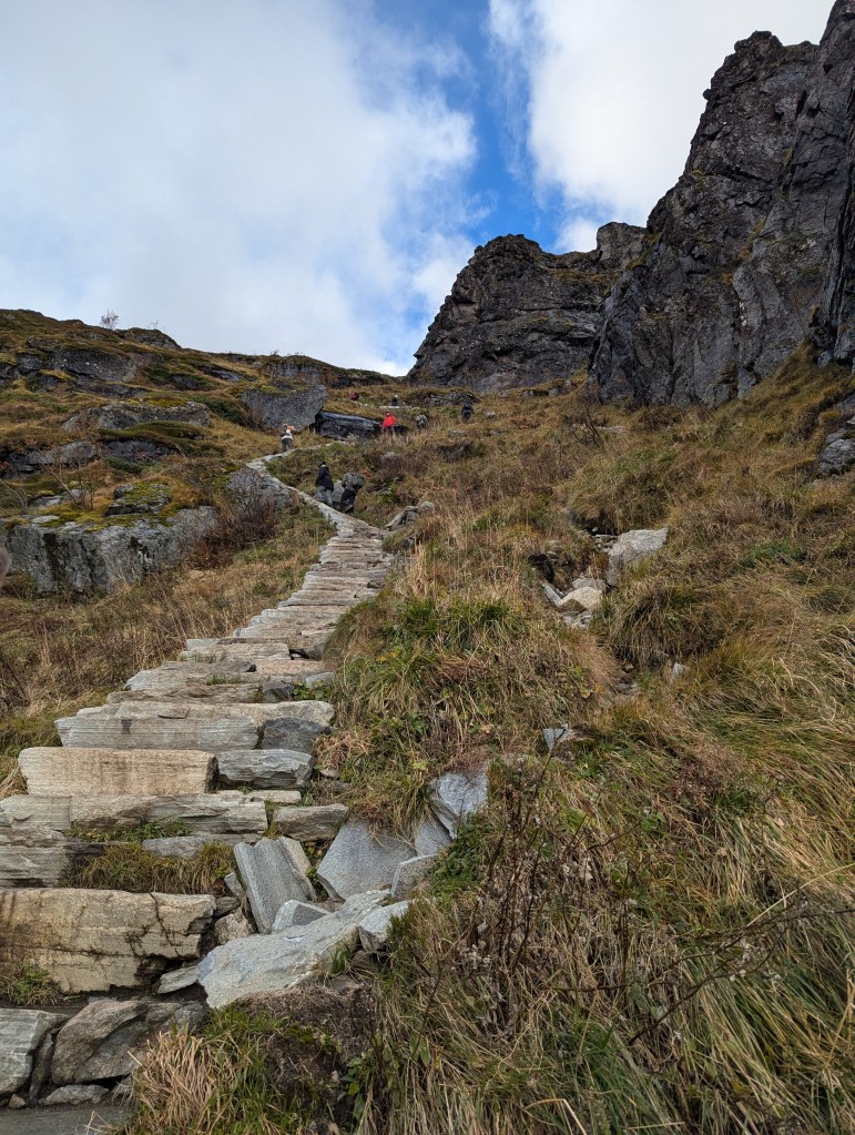 Reinebringen is the most famous hike in Lofoten. It used to be the most dangerous as well, but they built Sherpa steps almost all the way up to the top which makes it less challenging to hike. The Sherpa steps were added in 2016 and completed in 2021. It is 1978 steps to the top and quite a workout! I bet building the steps was an even harder workout!!
