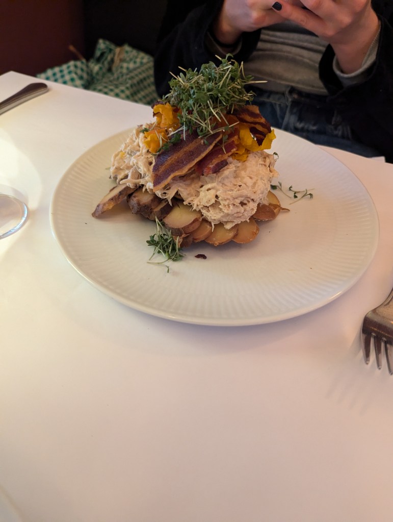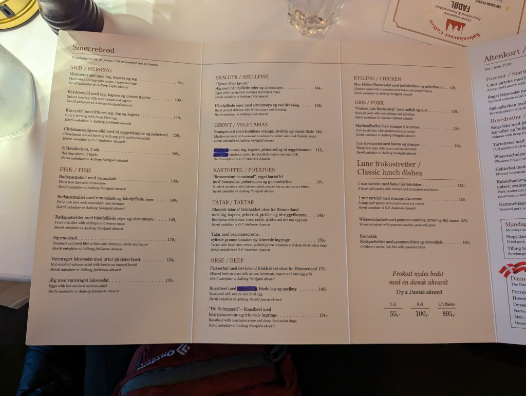 We also ordered aquavit, a traditional distilled spirit. Each table had aquavavit glasses by default, and it seemed like a good opportunity to try with our smørrebrød meal. The waitress warned us to wait until our food arrived to try the aquavit and that the glass contained about 3 to 4 sips. Without her warning, we would have struggled with the strong taste. It was better to have a tiny sip between bites of smørrebrød.