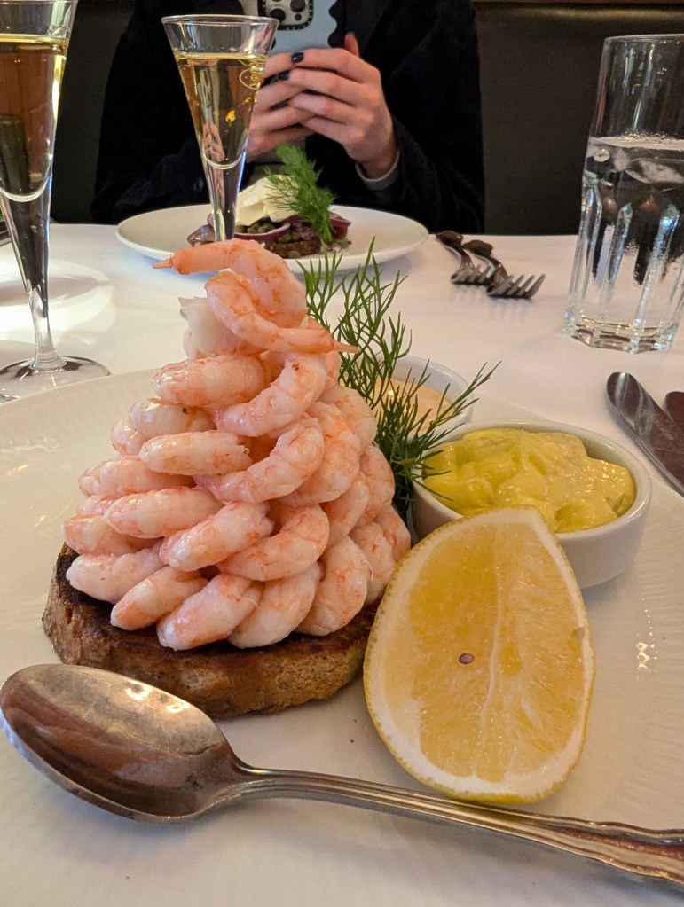 Hand peeled shrimps with lemon mayo and dressing. You can see the aquavit in the above picture too.