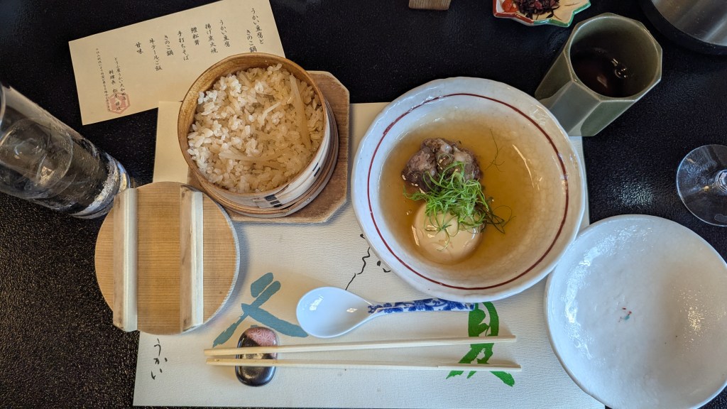 Before the tofu lunch, in the restaurant’s courtyard, there were some traditional Japanese children’s games. Here’s a game that Takuro’s mom is showing me: you stack up all the pieces and try to hit one out of the tower without knocking over the whole thing. It felt similar to Jenga but more challenging.
