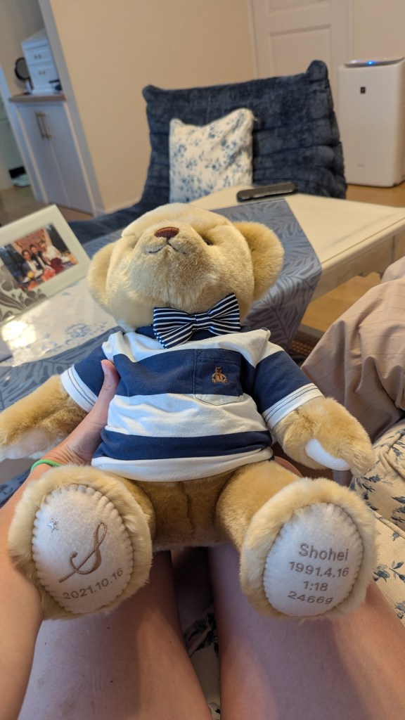 On the couch at Takuro’s parent’s house, I noticed a teddy bear next to me on the couch. It is a baby weight teddy bear that is the exact weight of Takuro’s brother when he was a baby. It was a gift given to his parents on his wedding day as a commemorative way to show gratitude. A typical baby weight, but much heavier than your normal teddy bear.