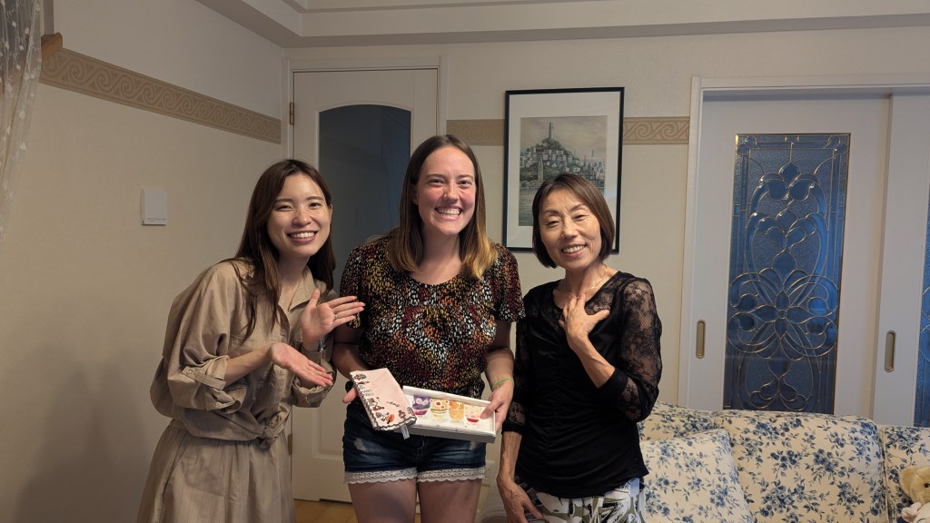 The night before, Seika and I made American sugar cookies, and we gifted them two of our most attractive ones. We also gave the Trader Joe’s bag to Takuro’s mom. Trader Joe’s bags are such good quality and also a very popular American item in Japan. Today, in America, the new mini bags for the Halloween season are out in stores. When I return home, I hope to acquire a few and send them in the mail.
