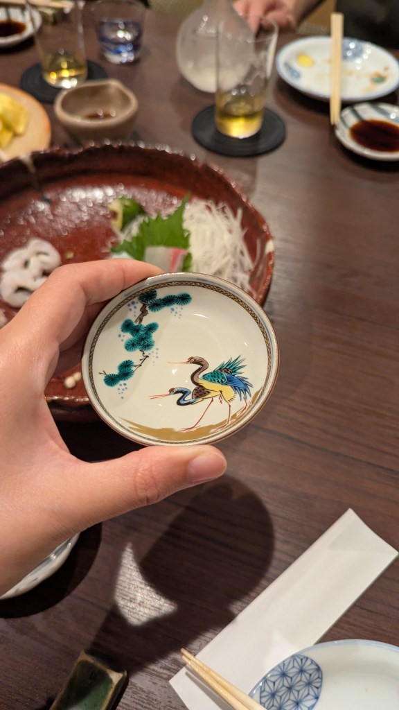 I would have eaten more blowfish, but I was too distracted by the conversation, the other foods, and also the 酒 (sake). We ordered rounds of sake, and with each round of different sake the waitress presented us new the sake glass options. I opted for a new one each time because it is a fun and decorative experience. Here is my collection of sake glasses.