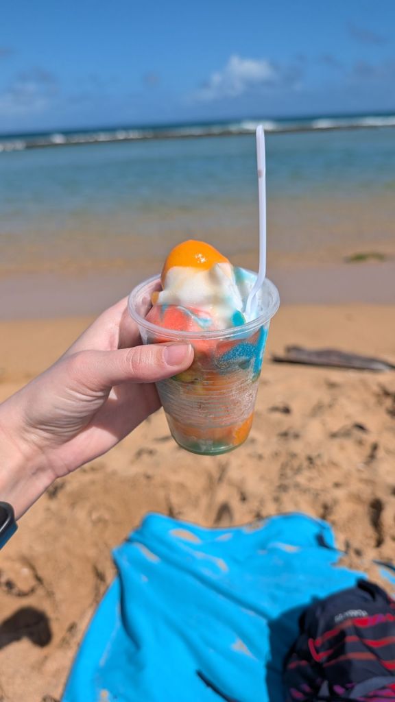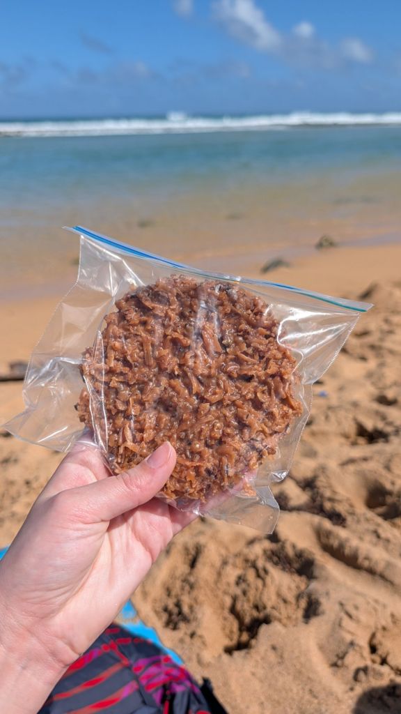 Piñones means pine nuts, and maybe I missed them, but I only saw 2 pine trees there. We arrived at the beach around lunchtime. We were curious how long we could enjoy the beach before we got hungry because we would have to walk 20 minutes back for food. Luckily, a couple vendors walked down the beach selling treats. I was elated to purchase some once-in-a-lifetime beach treats! One lady was selling something that looked kind of like peanut brittle, but with almonds, and her other item was a shredded coconut chocolate candy looking thing, I think a “dulce de coco”. I bought the coconut one out of curiosity. It tasted like coconut and sugar and was very sweet.