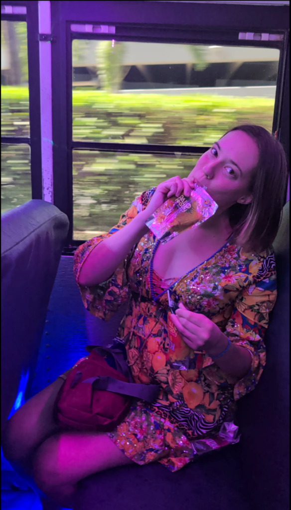 Here I am enjoying our welcome drink, which was like an alcoholic juice pouch. It was parcha (passionfruit) flavored.