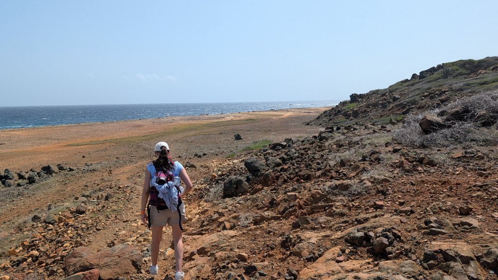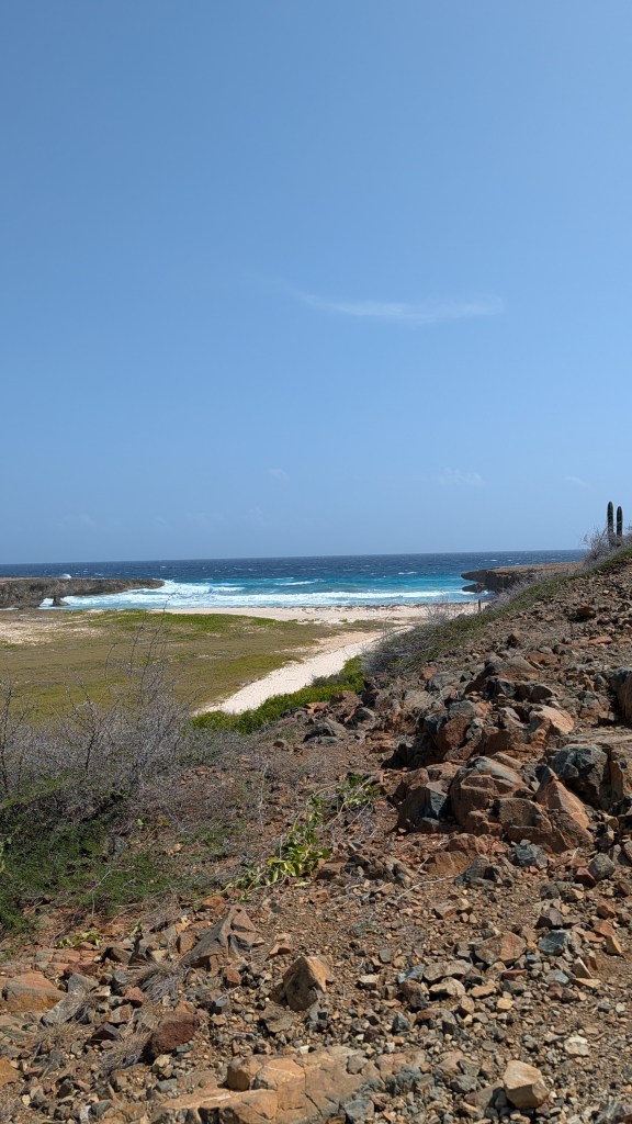 The Arikok National Park is on the northwestern part of Aruba, and the roads are too rough for a normal car to drive through. We bought our national park passes and then took the mildest road we could find to a parking lot that looked “normal car friendly” based on some previous Google Maps images. Julie drove very bravely and methodically along the dirt path to the parking lot that I hoped would work for us. It turned out perfectly! There were 2 small vans in the lot, but otherwise it was empty.