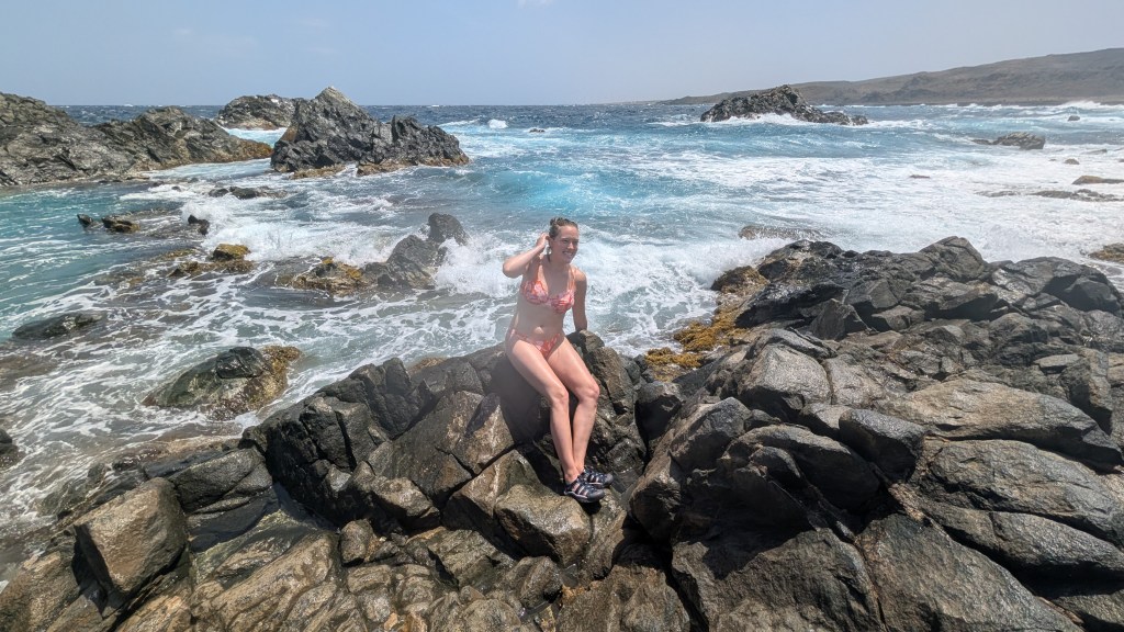 We also passed a tour on horseback heading back from the pools. One of the guides of the tour told us that the pools were too far to reach by hiking, but then told us he was joking and we were almost there. Arubians are friendly and funny. There was a park employee by the Conchi Natural Pools and confirmed that the pools were closed for swimming because of the strong winds and high tide, but there were a few shallow pools where we could relax. The pools were fuller and rougher, but he told us we could sit in the closest pool which was essentially a puddle. We sat in the very calm small pool.
