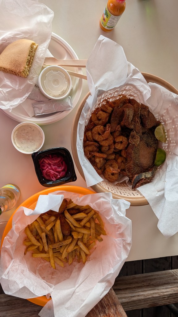 We ordered pickled onion, cornbread pancake, mayo, and fries to accompany our seafood. Essentially everything on the menu. We went down the list and was like “do you recommend we get the pickled onion?” “yes” “do you recommend we get the cornbread cake?” “yes” The answer was always yes.
