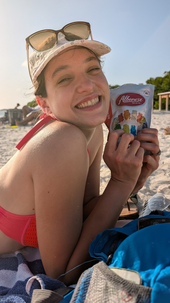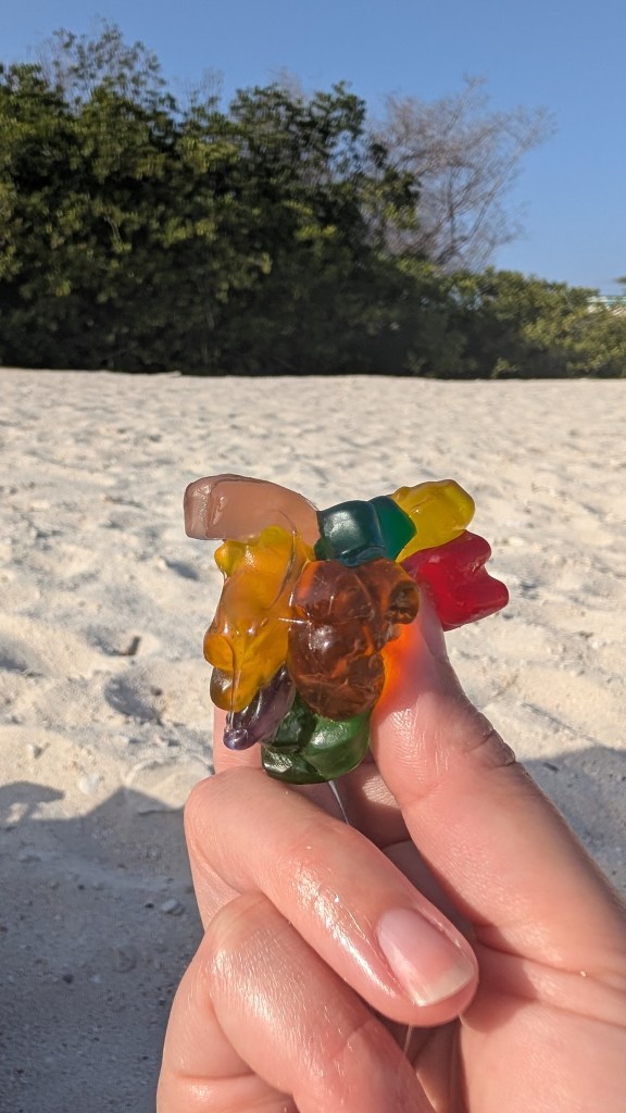 We didn’t snorkel here. We were too tired from our Baby Beach and Zeerovers adventures. Instead, we opted for a beach nap and to eat some sun-warmed Albanese gummy bears that Julie brought for us. Yum! They had all fused into a super gummy bear.