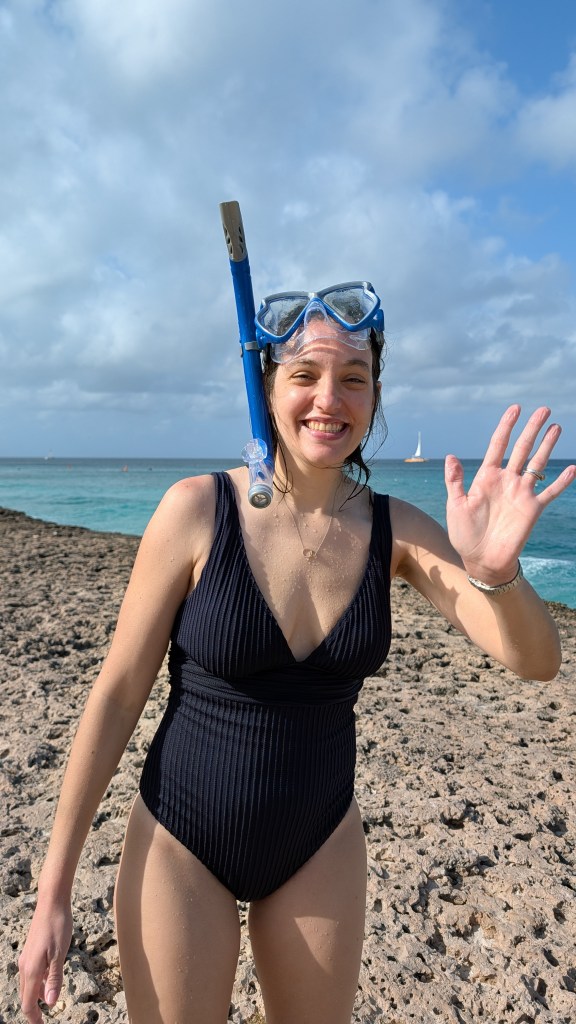 Baby beach, at the southeastern tip of the island, is a very round and calm lagoon beach. Julie and I immediately hopped in and snorkeled. The beautiful turquoise water was gentle and shallow. We both wore snorkel masks, and I had my phone in a waterproof case to record the underwater wildlife.
